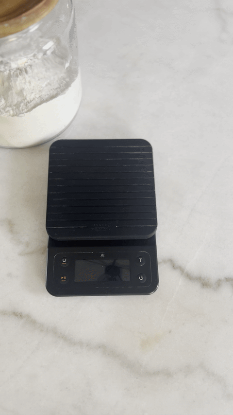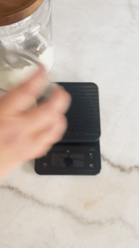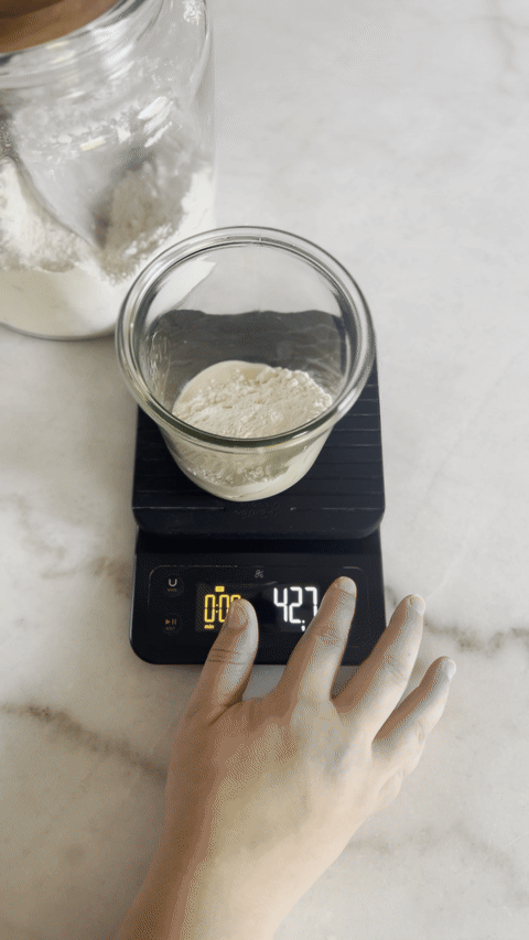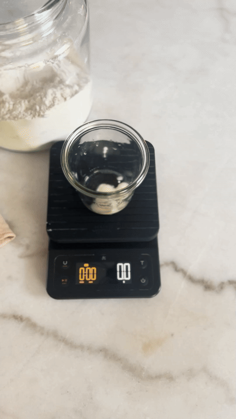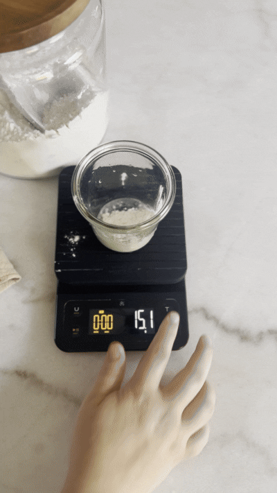 This will give you 100g for my loaf recipe, plus 5g leftover to keep your starter going. This leaves about enough to feed it the “tiny starter maintenance” ratio 1:5:3 (3g starter + 15g flour + 10g water). This will be great for feeding, letting it sit for 1 hour, and popping back in the fridge.